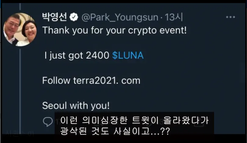 3. 박영선은 서울시장 출마 때 재난지원금 코인으로 준다 했고 그 발언 이후 박영선 트윗에 "루나 투더문" 올라옴 박영선은 해킹당했다 주장함