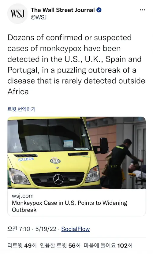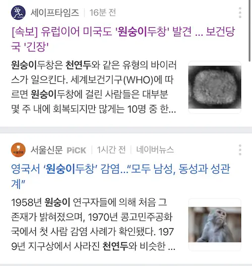 치사율 10프로 원숭이 천연두 두창 바이러스 미국 영국 등 확산중