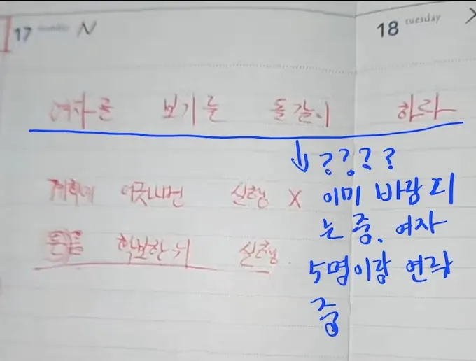 그리고 너의 일기장에는 여자들 이름을 5명 이상씩 주르륵 적어놓고 날짜별로