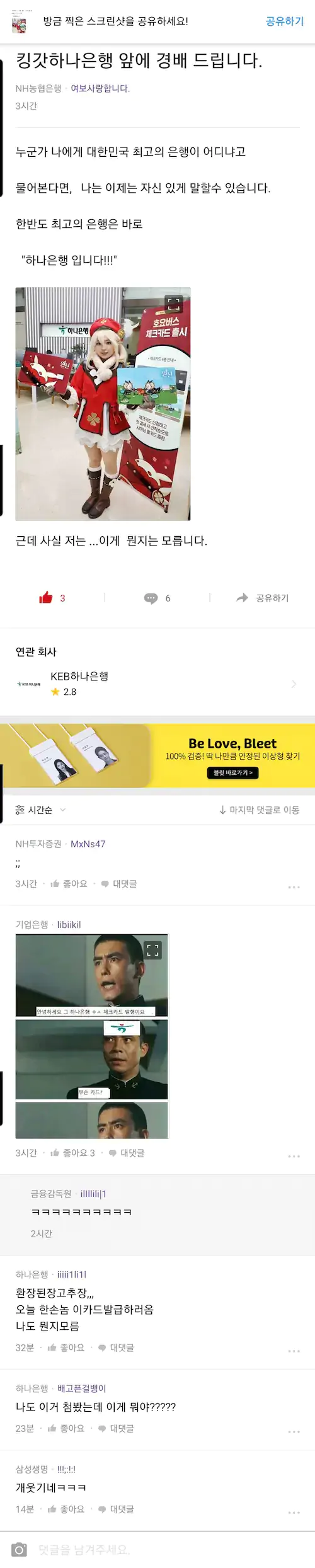 여기서 은행직원 움찔하더니만 신분증 찍어야해서 카메라키니까 오마이갓 지저스 크라이미닛 갤러리하고 연동되어있어서 직접캡처한 씹덕짤 다들킴