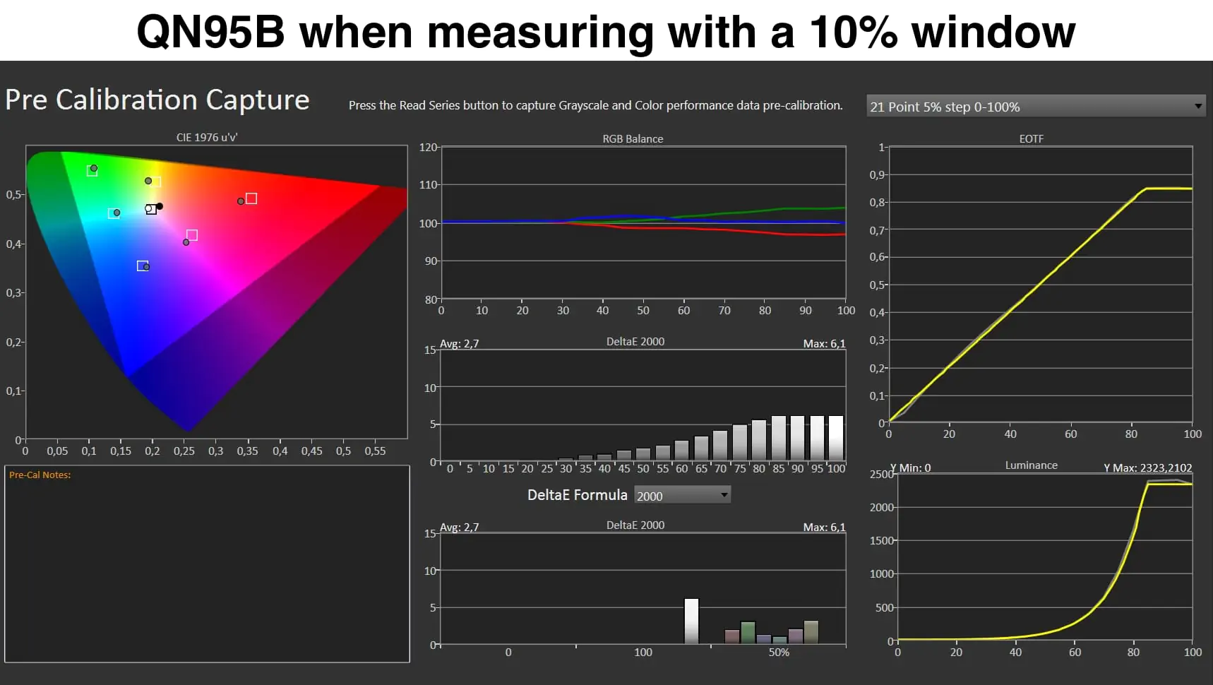 두 사진 사이를 이동하고 오른쪽의 'EOTF' 및 '휘도' 그래프에 초점을 맞춥니다. 노란색 선은 기준 대상이고 회색 선은 측정값을 나타냅니다. 9% 창 테스트를 사용할 때 회색 선이 훨씬 높다는 사실은 실제로 QN95B가 전체적으로 상당히 과도하게 밝은 이미지를 가지고 있음을 의미합니다. 또한 9% 창으로 테스트할 때 최대 밝기(Y Max)가 얼마나 낮은지 확인하십시오.