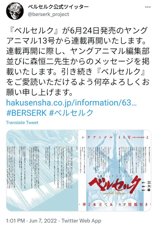 — ベルセルク公式ツイッター (@berserk_project) June 7, 2022