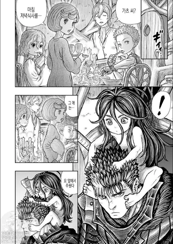 애초에 요정왕국으로 가고 캐스커 기억찾으면서부터 그림체가 많이 밝아짐 초반에 그 그로테스크한 분위기에서 벗어나서 가츠도 좀 독기가 빠졌고 오히려 분위기가 밝아지면서 이제 종점으로 가는게 아니냐 라는 말이 있었는데 난 괜찮다고 봄 어차피 그리피스랑 맞짱뜰때는 다시 그로테스크하게 바뀌겠지