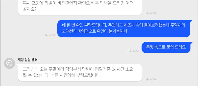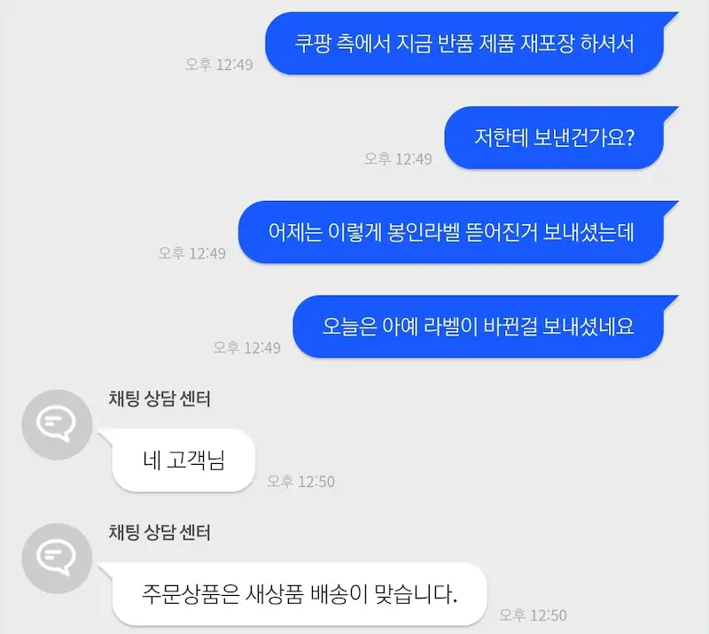쿠팡 고객센터는 항상 걍 이유도 다 안듣고 무조건 다시보내준다고함. 지들돈 아니라고 막 반품 때리나본데 이게 나한테 문제가 뭐나면 이새끼들이 이유를 ㅈ도 흘려듣고나서 교환처리를 시키는거니깐 두번쨰에도 첫배송과 똑같은 문제가 발생함 ㅋㅋ 이거 무한루프임 얘네. 내가 3~4번까지 루프 돌려봄 ㅋㅋㅋ 고객이 제풀에 지쳐서 나가 떨어질때까지 할 생각인가봄