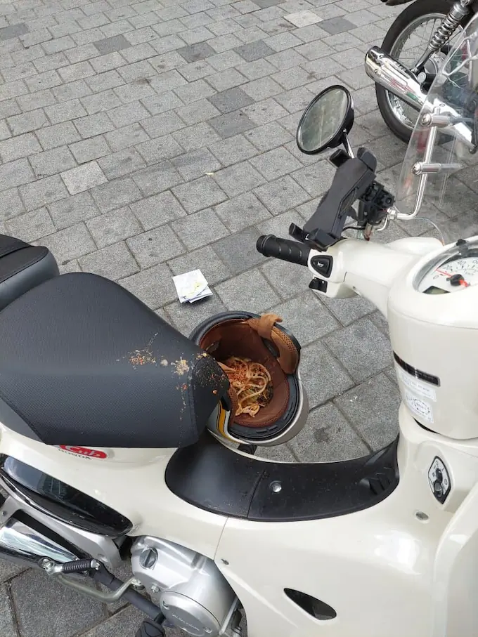 신림역에서 주차된 오토바이 헬멧에 어떤 남성이 음식물 스파게티를 버려 테러한 사건