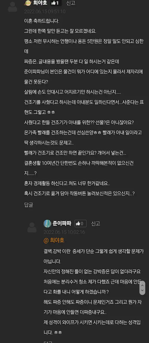 결벽. 강박으로 이혼소송을 하더라도 재산이 그렇게 많지 않아서 둘이 잘 이야기해서 협의이혼으로