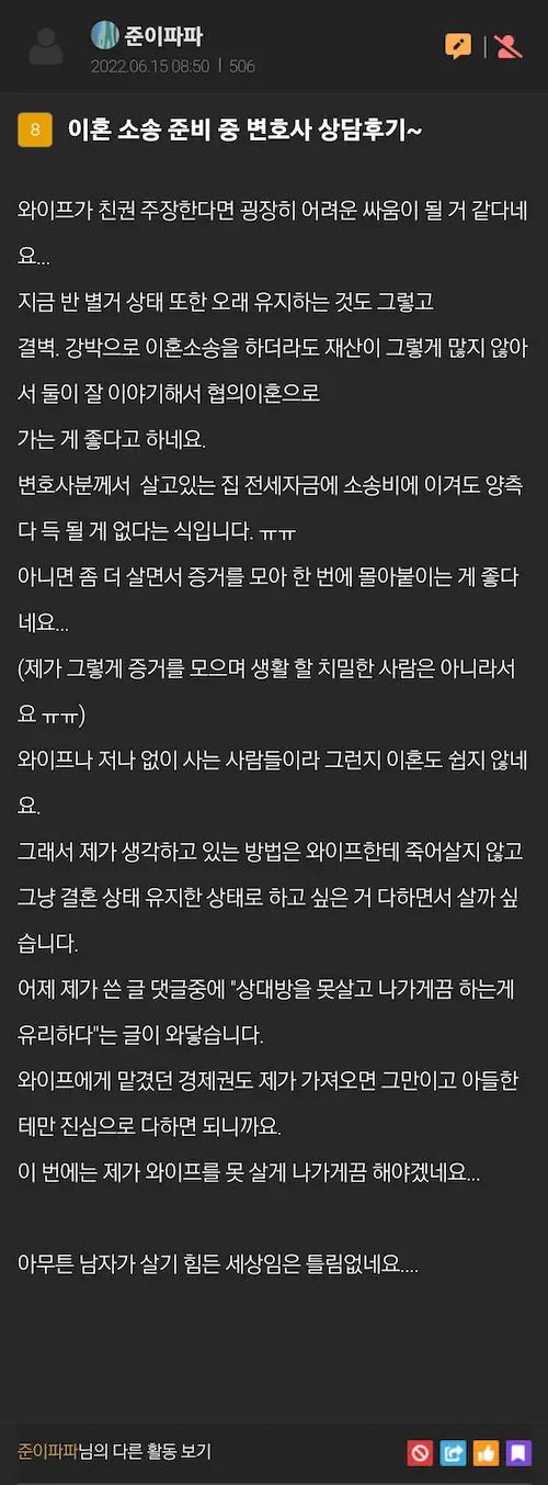 와이프나 저나 없이 사는 사람들이라 그런지 이혼도 쉽지 않네요.