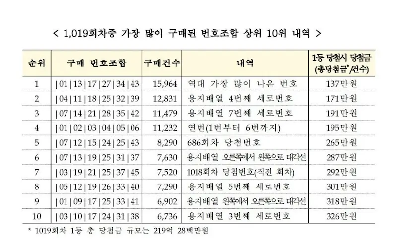 특이한 번호들은 그 번호 사는 놈드이 1만 명이 넘어가서 1등 당첨돼도 130만 원밖에 못 받는다고.