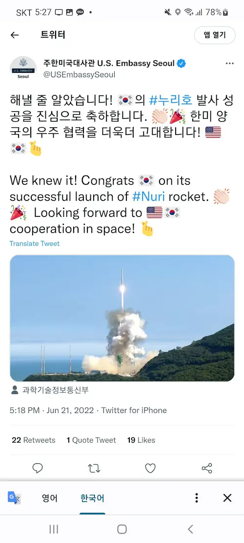 누리호 발사 성공 후 주한미국대사관 트위터 반응. 누리호 발사 성공을 축하