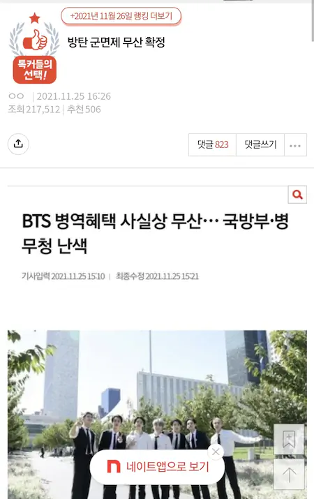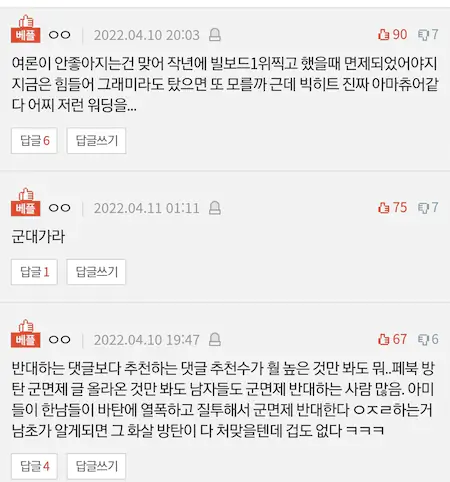 방탄 군면제 여초 반응