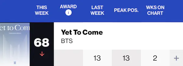 방탄 2주차 빌보드 순위 13위->68위 개떡락ㅋㅋㅋㅋ