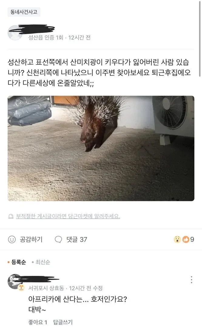 제주도에서 누가 유기한 건지 제주도에 살지 않는 아프리카에서 사는 호저 발견