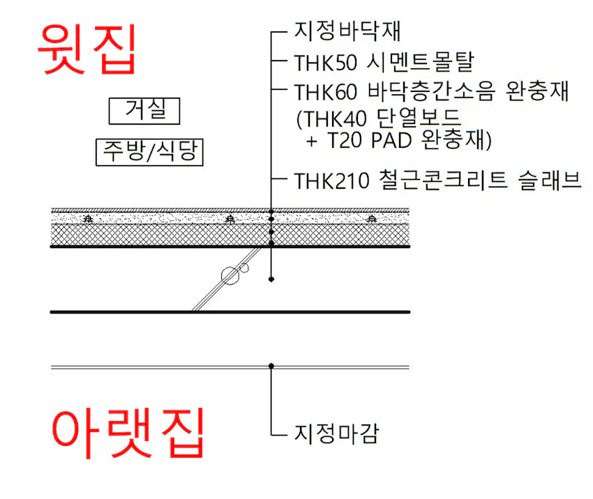 지정바닥재 밑에 시멘트몰탈 5cm 가 있고 그밑에 완충재가 있어