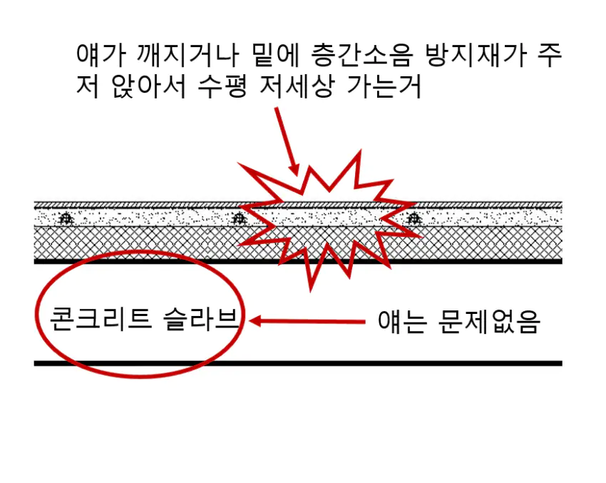 근데 문제가 되는건 하중을 버티는 구조채, 바닥슬라브가 아니라 저 위에 올라가있는 마감이 못버텨