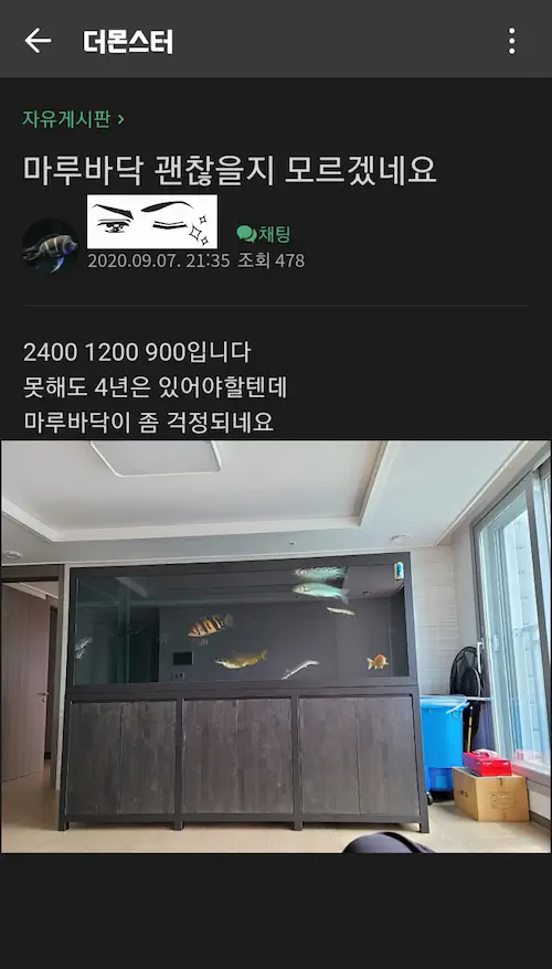 저거 만들어준 업자도 문제인게 3톤짜리 쳐 올리면서 다이를 다리 달린 놈으로 씀. 돌바닥도 아니고 ㅋ 만들어 달란 어항 주인나 만들어 준 업자나 그냥 쌍으로 잘못함