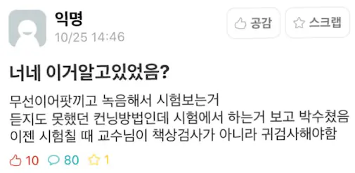 뭐냐 보이스톡으로 부정행위 했으면 무선 이어폰 낀거인가? 교수가 시험에서 체크안함?
