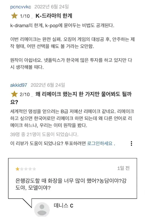 진짜 거품좀 빼자ㅋㅋ 킹덤 대박치고 오징어게임까지 잘갔는데 얘네 빨로 우리학교어쩌구같은 연출력 개폭망 ㅂㅅ드라마도 어거지로 히트시키고 이제 그보다도못한 지옥, 김치의집 이딴거 쳐만들고 대작선동하고있으니 쌍욕을먹지ㅋㅋㅋ