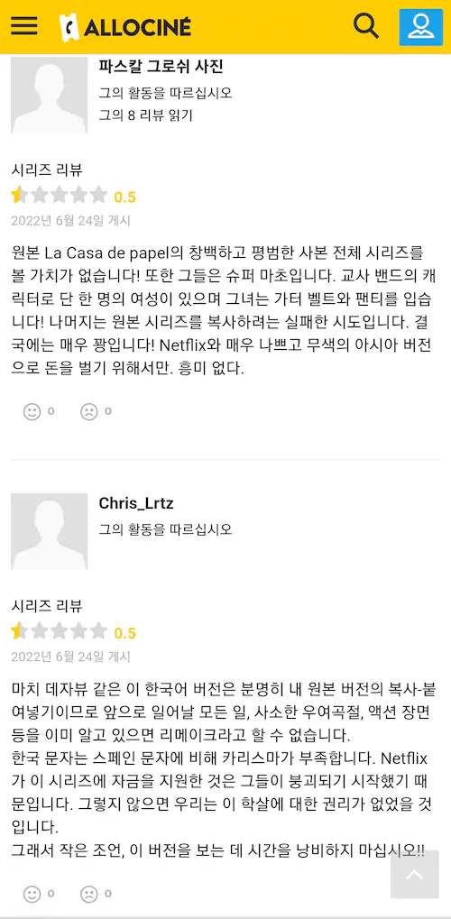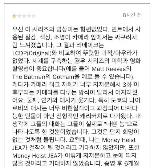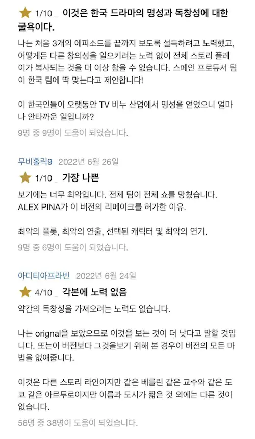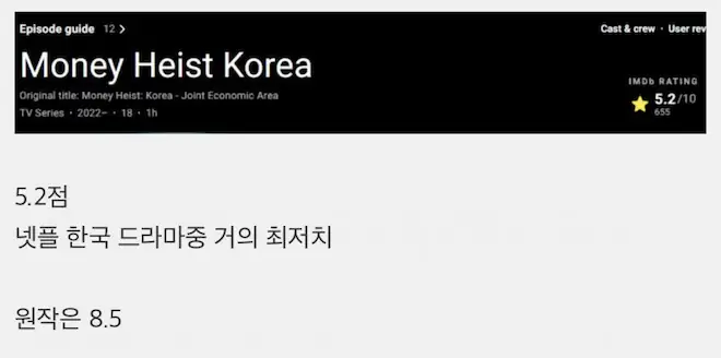 시즌당 13화씩 있는 5시즌 드라마의 2시즌을 압축해서 6회로 끝내 낸 거임 뭔가 간추림과 정답에 집착하는 한국인 종특이 들어간 k-드라마라고 생각함 원작 종이의집은 스페인 유럽권이라 전세계의 문화전파력에서 친숙함으로 다가갔을 거. 카메라 앵글이나 강도들 팀웍 세세한 부분이 보다보면 다름. 애초에 원작에서 그렇게 까지 조폐국을 털 이유부터 인질도 공범이 되 가는 과정이 말 안됨. 한국에선 일어날 일이 아님. 누가 10억 주겠다고 공범을 하냐 인질이? 한국에서 거기다 세계 초유의 사태라고 할만한 조폐국(한은)을 터는데 10억으로 공범? 강도는 4조원 가져가는데?