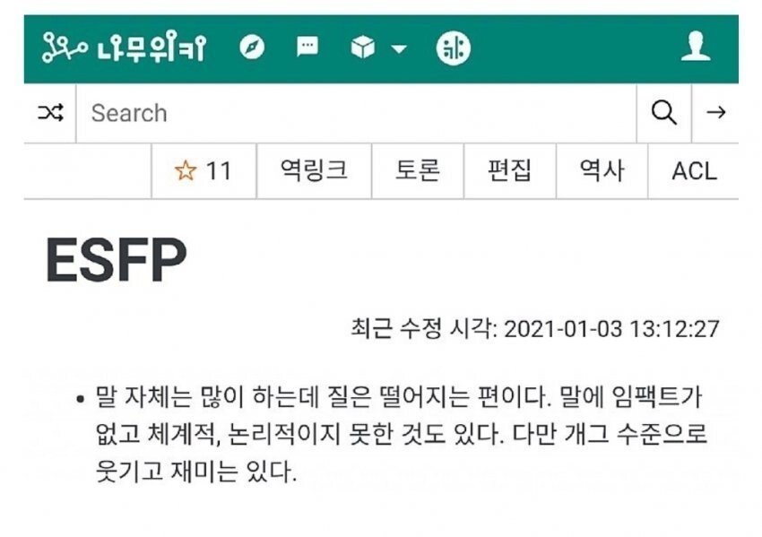 ESFP : 말 자체는 많이 하는데 질은 떨어지는 편이다. 말에 임팩트가 없고 체계적, 논리적이지 못한 것도 있다. 다만 개그 수준으로 웃기고 재미는 있다.