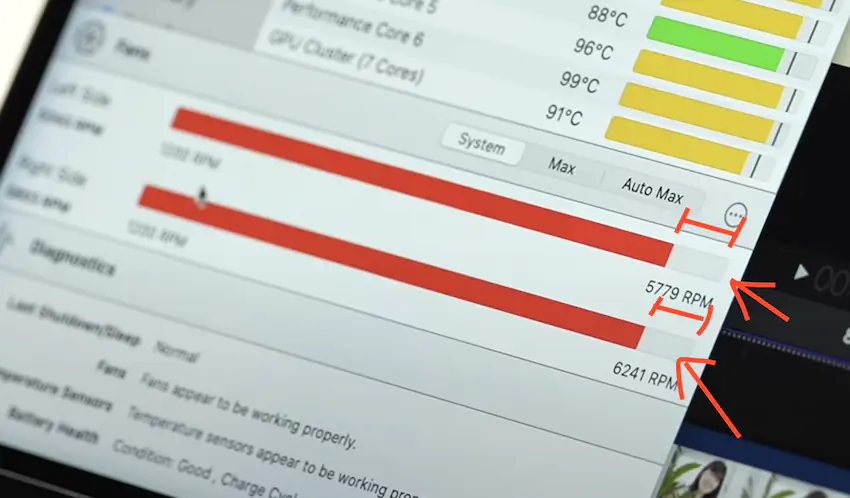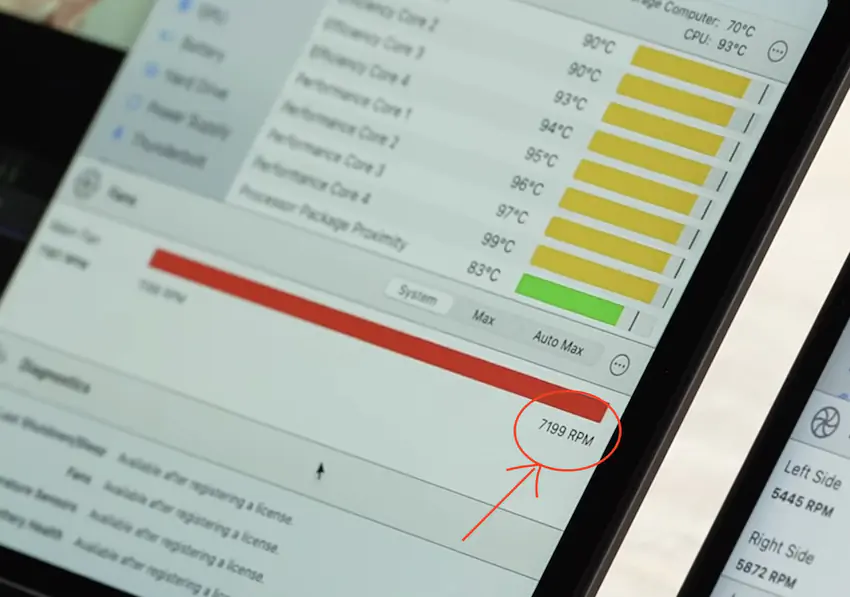 팬은 최대치인 7200RPM로 작동했음에도 발열이 지속되었기 때문에 M2 칩을 쓰로틀링 하는것 밖에는 MacBook Pro가 자체적으로 냉각할 수 있는 방법이 없습니다.