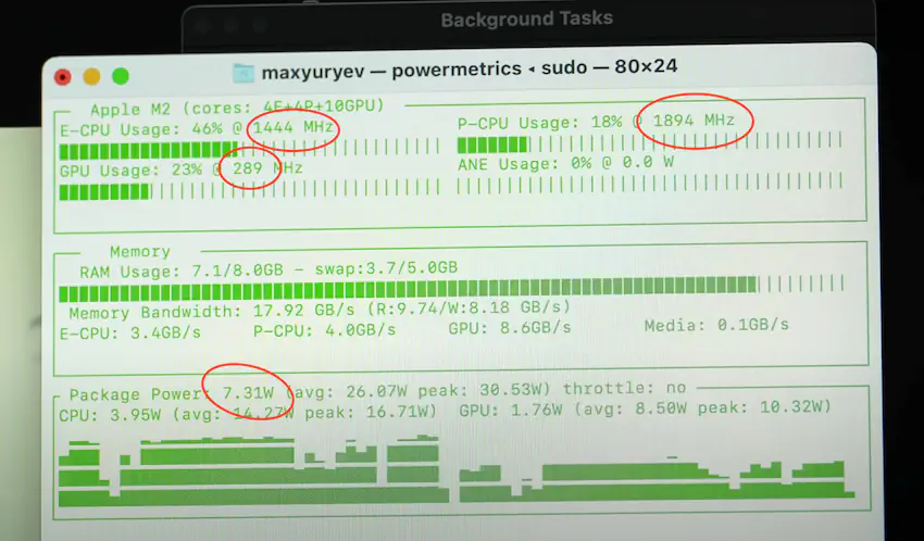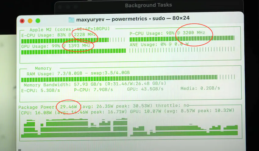 M2 칩은 순식간에 P코어 클럭 속도를 3200MHz에서 1894MHz로, E 코어를 2228MHz에서 1444MHz로, GPU를 1393MHz에서 289MHz로 쓰로틀링 했습니다. 그 결과 전체 M2 프로세서패키지 전력이 29.46W에서 7.31W로 떨어졌습니다.
