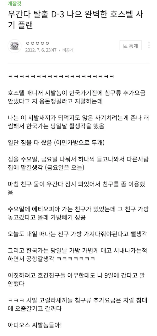 걔는 내가 이지랄 해놓고 간 사실을 모르고 아캄웨시 호스텔에 방잡으려 들어갔다가 경비랑 매니저한테 둘러쌓이면서