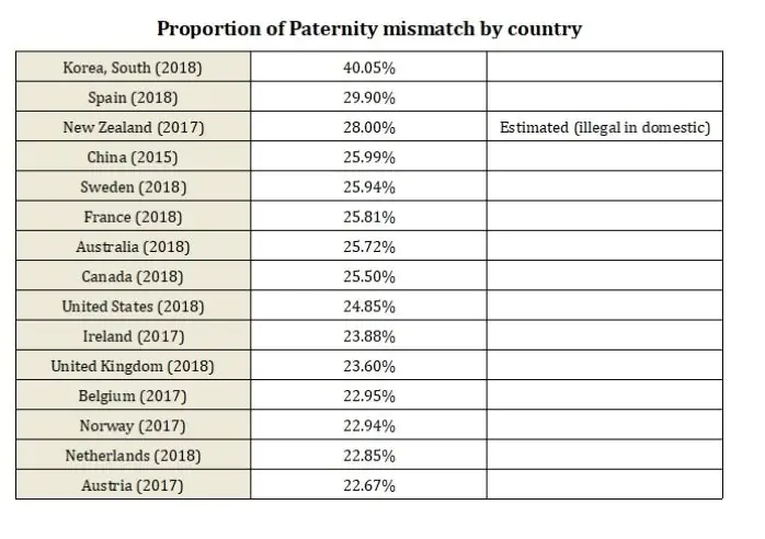 한국에서도 이를 증명이라도 하듯, 2014년 한국 법원에서 접수된 친자확인 및 부인 소송 4661건 중, 약 30%가 친자가 아니라는 결과가 나온다고 한다.