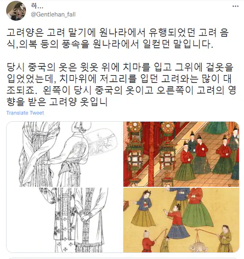 1. 전통 중국옷은 원피스 형태인데 저거만 투피스인 이유가 고려옷이기 때문
