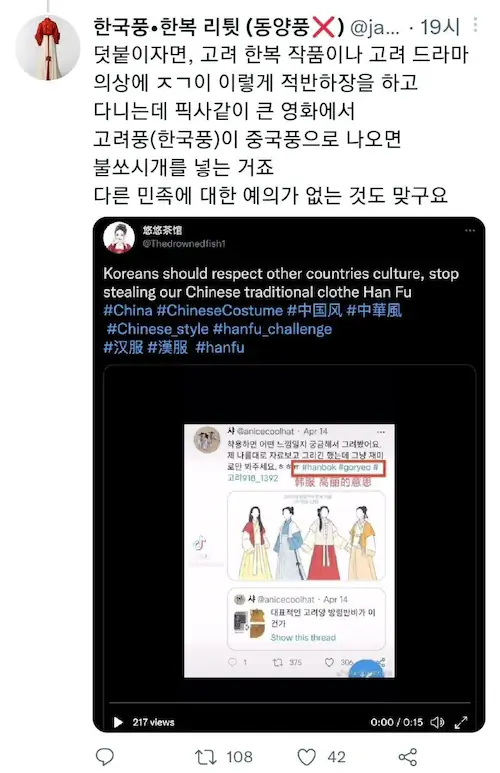 4. 저게 중국 옷으로 알려지면 한복이 중국 영향이라는 말에 더 힘실어주는거임.