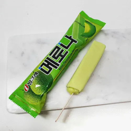 메로나에는 치자청색소+ 심황색소(울금)로 청색에 노란색을 섞어서 색을 낸다.