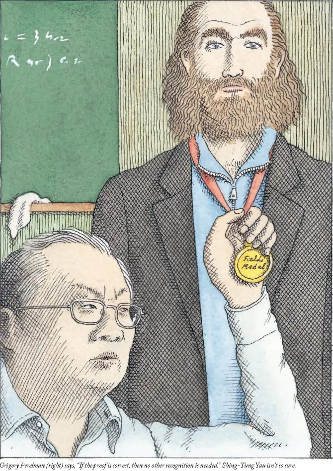 그리고 4개월 후 야우싱퉁을 기회주의자로 묘사하는 글이 페렐만의 목에 걸린 필즈상 메달을 낚아채는 그림과 함께 더 뉴요커에 실리자, 명성에 흠이 간 야우싱퉁은 법적 대응을 하겠다고 했다. 그러자 뉴요커는 완전한 사실에 입각한 것이라고 맞받아쳤다. 하여간 야우싱퉁은 뉴욕 타임즈에서 수학계의 황제라고 묘사될 만큼 실력은 뛰어나지만, 명성에 매우 집착하는 스타일인 듯하다. 야우싱퉁 본인도 푸앵카레 추측까지는 아니어도 난제에 가까운 정리들을 여러 개 증명하여 페렐만 이상의 다양한 업적을 가진 위대한 학자이다. 문제는 그의 하찮은 시다바리 제자나 중국 후배들까지 페렐만과 동급으로 취급 하려드는 작태이다. 페렐만의 엄청난 업적이 그런 중국인들이나 화교 수학자들 수준에 비할 바가 아니란 것은 본인이 더 잘 알텐데도 그랬으니 언론에서도 곱게 보지 않은 것이다.