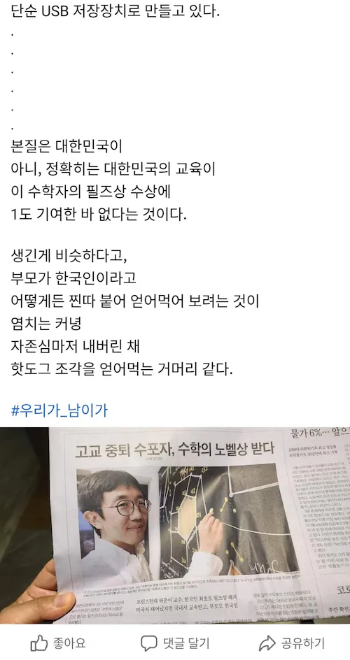 외과의사의 허준이 교수의 필즈상 수상과 한국 교육 페이스북 글