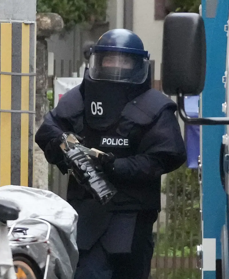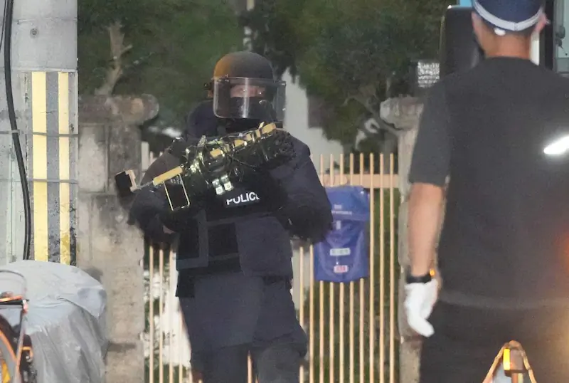 아베 전 일본 총리를 총격한 야마가미 테츠야 용의자 집이 있는 맨션으로부터 폭발의 가능성이 있는 증거품 등을 압수하는 수사 관계자. 9연산탄 총과 6연탄 + 스코프를 범인 집에서 압수