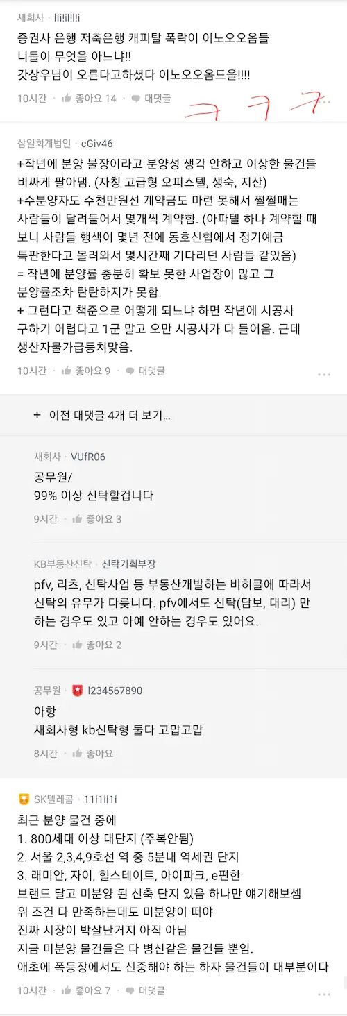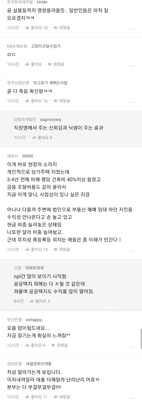 부동산 폭락과 금리 상승 현재 금융 시장 분위기에 대한 블라인드 우리은행 직원 글. 은행이 수익을 포기할 정도인 거면 ㄷㄷ 잘가라 영끌게이야 영끌충들은 이제 ㅈ된거임 더이상 집값 설거지