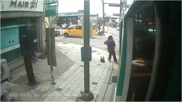 용인에서 한 여성이 버스에서 내린 후 자해공갈을 위해 타이어 앞에 발을 대고 있다가 버스기사에게 발각됨
