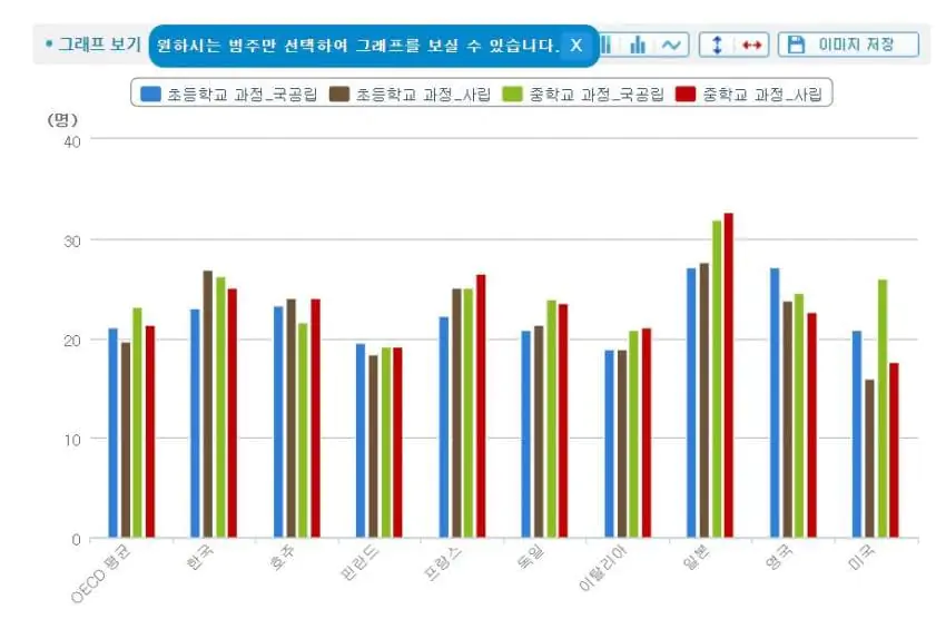 가장 oecd에서 학급당 학생수가 많은 나라가 일본인데 그래봐야 중학교에 학급 학생수 평균 32명임
