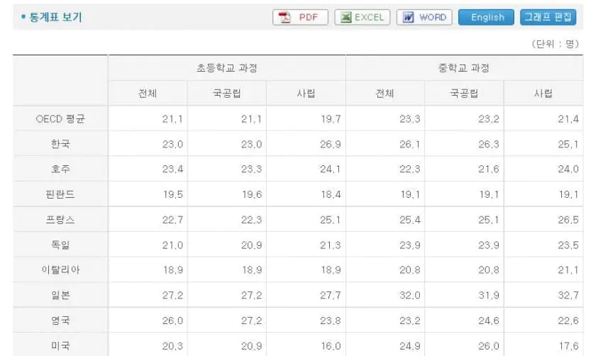 참고로 한국은 이미 학급당 학생수 oecd 평균에 이제 거의 근접했음 교사 임용자들 다 발령 시키면 학급당 평균 14명 정도