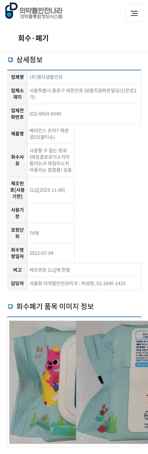LG생활건강의 유아용 물티슈에서 살균제 성분이 검출되어서 식약처의 회수명령 받고 법적으로 홈페이지에 해당 사실 고지해야함