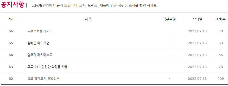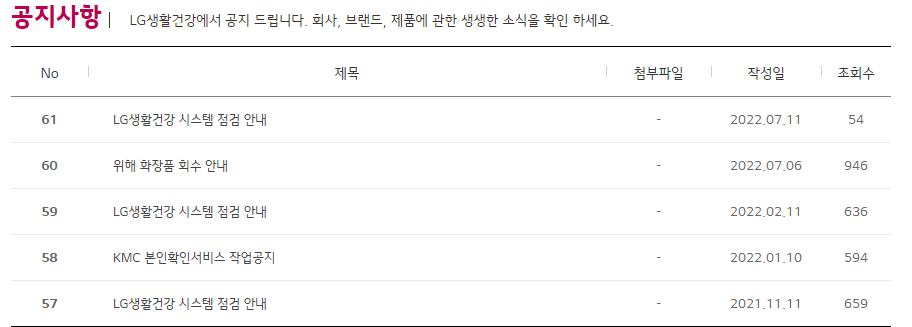 엘지생건 홈페이지 공지사항에 물티슈 회수 관련 공지 올라옴