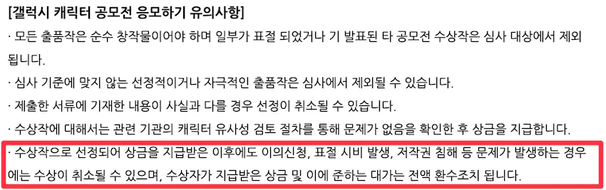 이런 거 보통 수상 시 사회적으로 논란거리 있으면 일방적으로 수상 취소될 수 있다고 주의사항에 적어놓지 않나? 기업 이미지 보호 차원으로