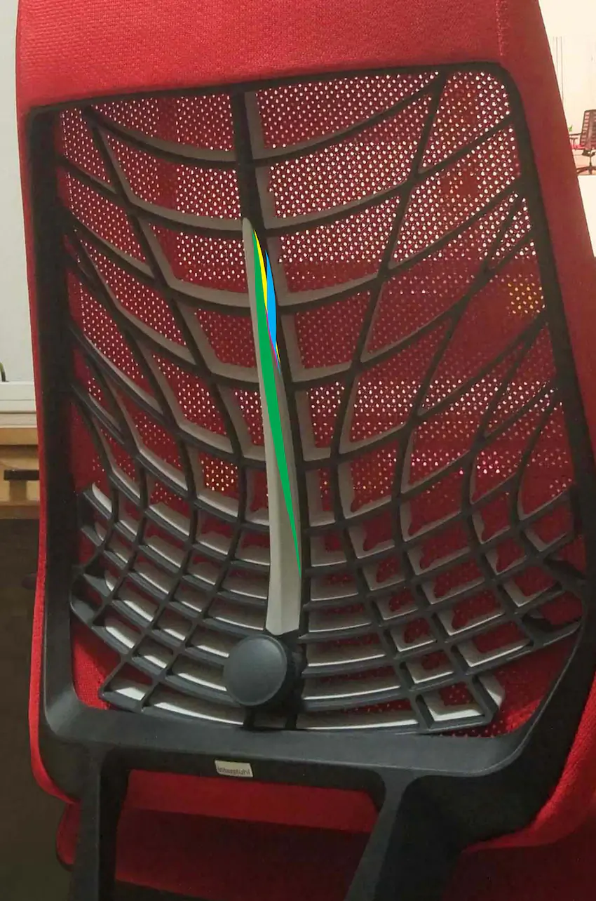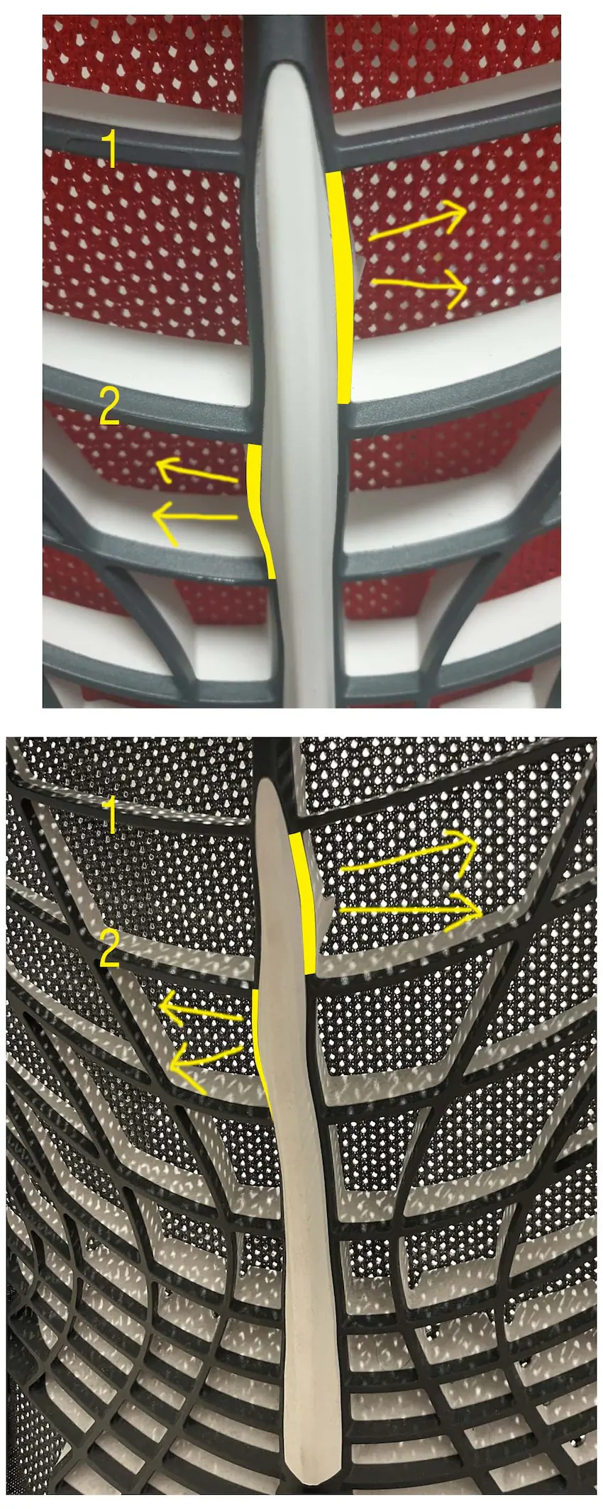 2. 조이스 중심뼈대 실리콘은 뼈대의 플라스틱과 수직으로 연결되어 있는데 디자이너가 중심뼈대의 플라스틱 두께와 전체 나뭇잎 두께를 맞추었지만, 등판 강도를 현재로 유지하면서 중심 뼈대 두께 안 보일 정도로 중앙 실리콘 두께 증가 후, 뼈대와 맞닫게 접합하면 지금과 유사한 유연성과 높은 강도를 유지할 수 있을 것으로 본다.