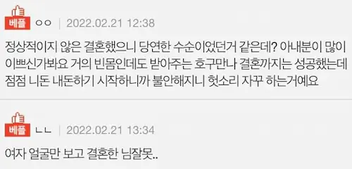 정상적이지 않은 결혼했으니 당연한 수순이었던거 같은데? 아내분이 많이 이쁘신가봐요 거의 빈몸인데도 받아주는 호구만나 결혼까지는 성공했는데 점점 니돈 내돈하기 시작하니까 불안해지니 헛소리 자꾸 하는거예요