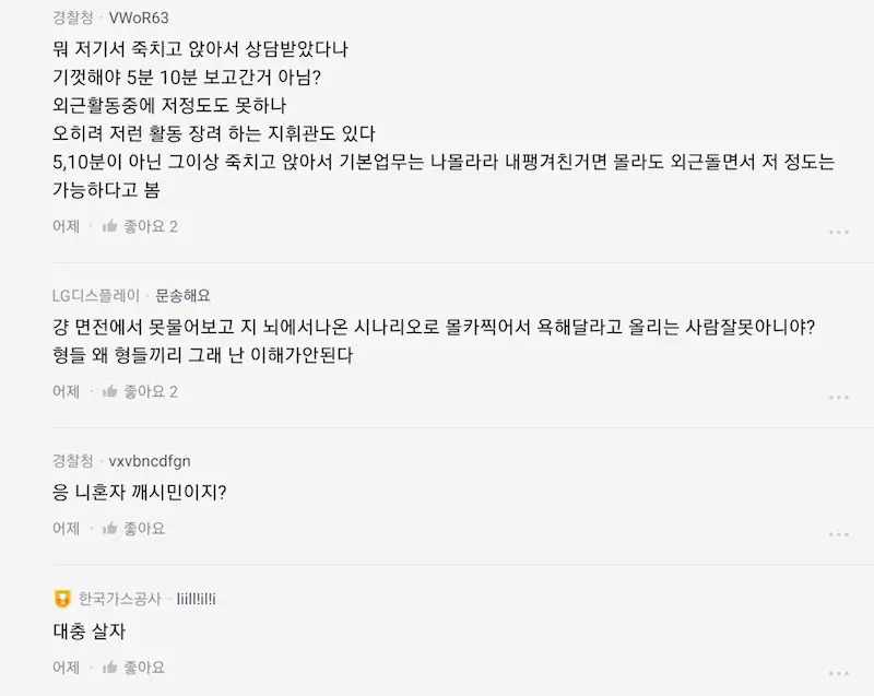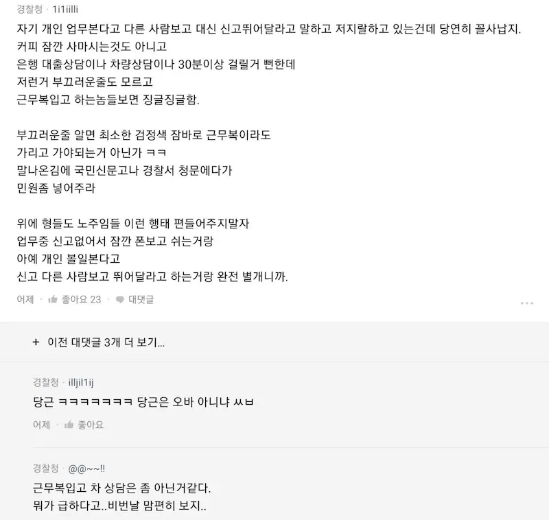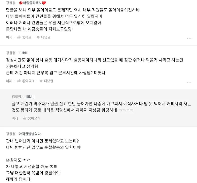 경찰들 관련 글만 올라오면 말도 안 되는 이야기 하며 논리수준도 비약하게 자기 식구들 감싸는데 좀 심각해 보임.
