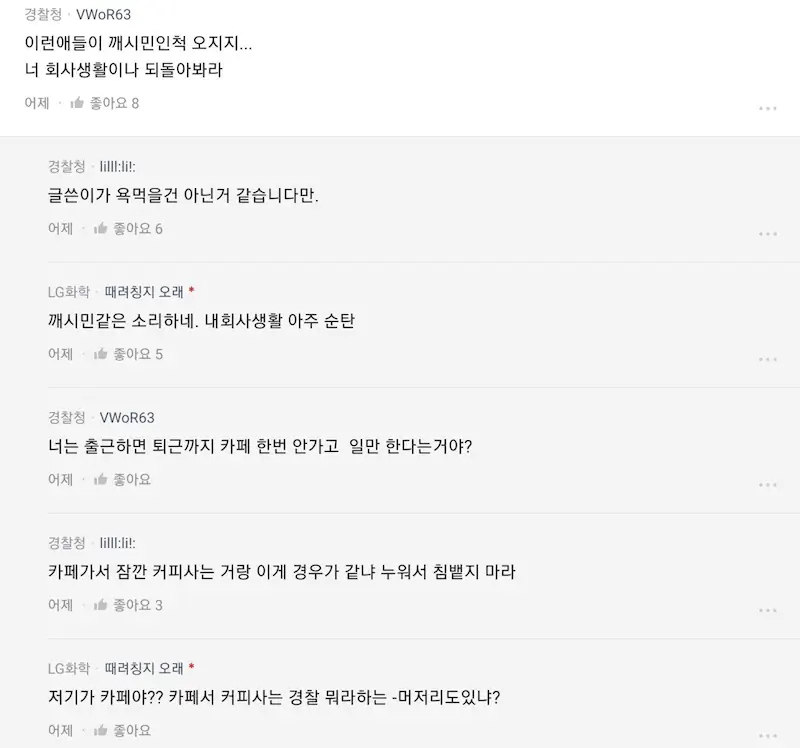 커피 테이크아웃이나 하지 일반 사기업에서 누가 카페가서 노냐 ㅋㅋ 그냥 저 견찰 입에서 나오는대로 씨부리는 개소리임