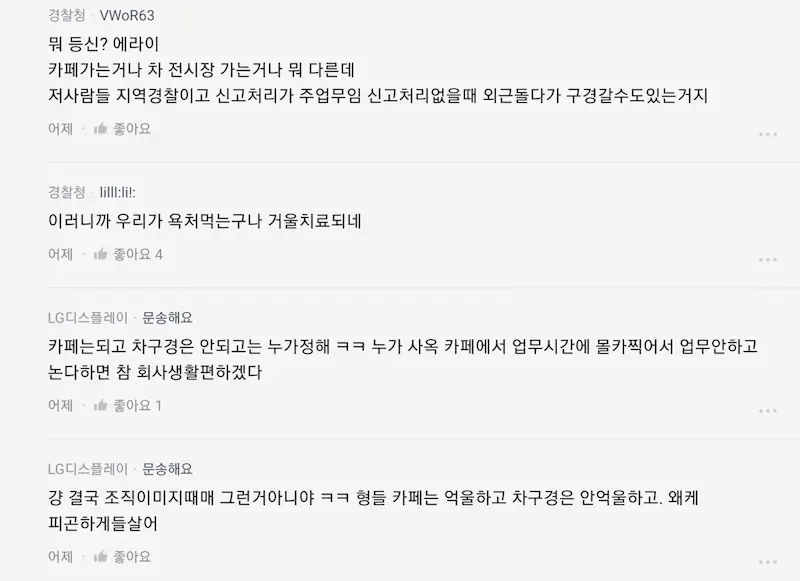 근데 진짜 블라인드 보면 경찰들이 유독 수준이 낮은것 같음;