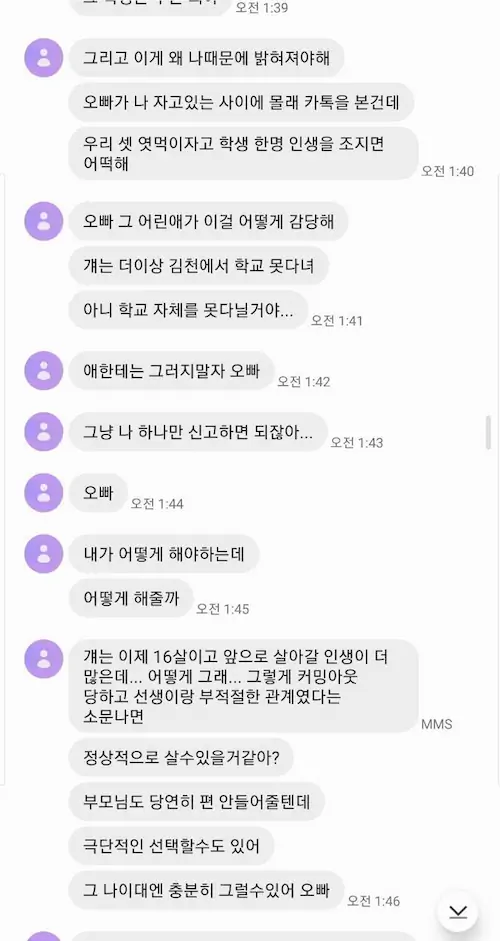 저는 해당 교사가 제 여자친구였던 사람에게 보낸 미성년자인 학생과 사랑한다면서 나눈 대화 및 성관계를 의미하는 내용 등을 캡쳐한 문자를 보았고 또한 제 옆에서 러브젤이나 성관계에 대해서 전화로 통화 하는것 또한 분명히 들었으며 이를 알게되고 나서 당시 전 여자친구에게 물어보니 둘의 관계가 1년 정도 넘었으며 처음엔 전 여자친구도 이 관계에 대해 반대를 하였으나