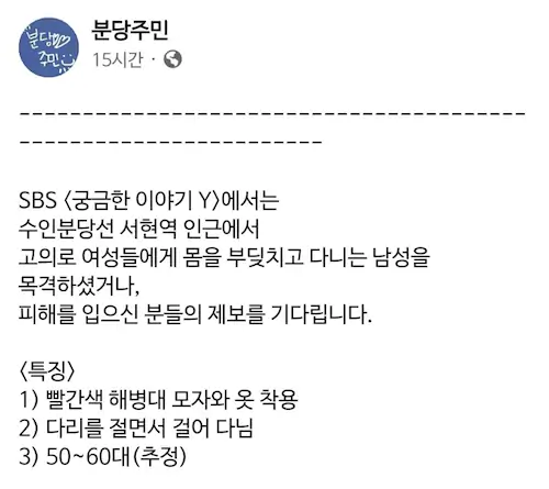 sbs 방송 궁금한 이야기 y에서 분당에서 나이 50~60대로 추청되는 해병대 옷을 입고 여성들에게 고의로 몸을 부딛치고 다닌다는 신원미상의 남성