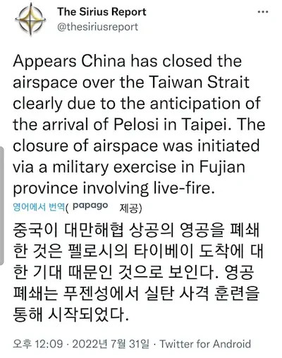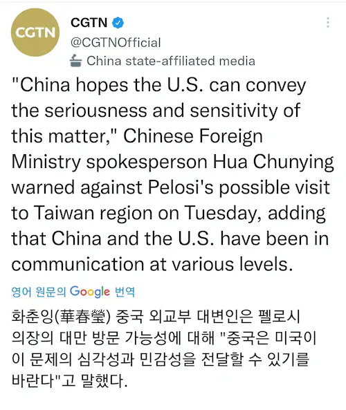 펠로시 하원의장이 대만으로 갈 예정에 발작하는 중국