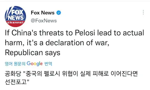 미국 공화당 "중국의 펠로시에 대한 위협이 실제 피해로 이어진다면 선전포고"