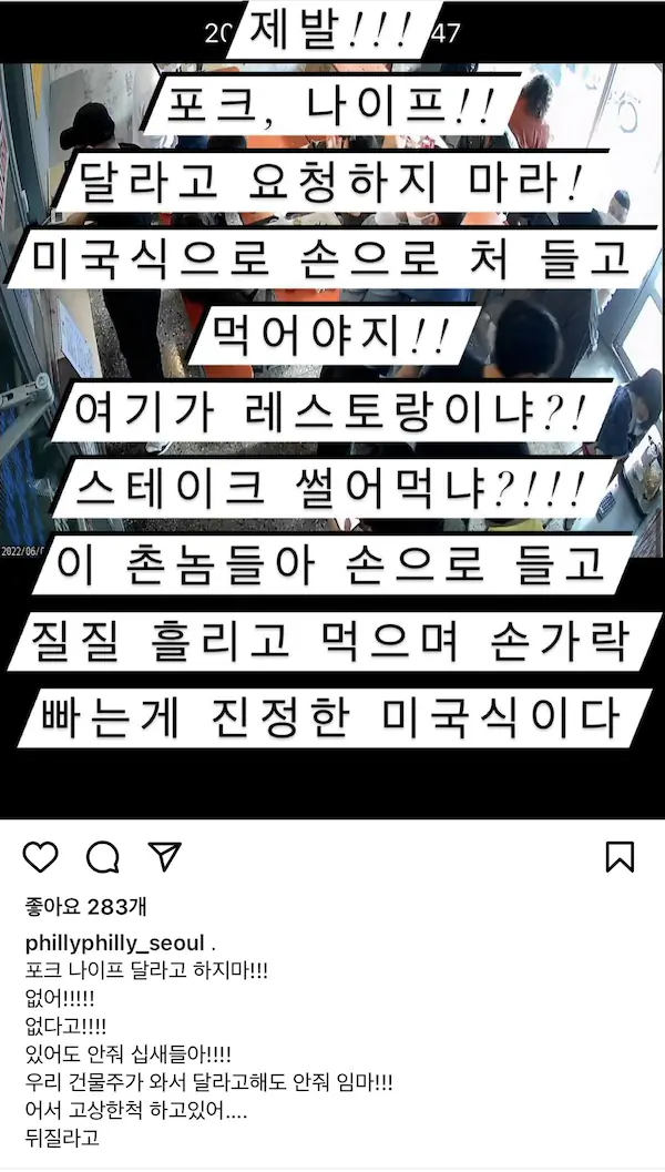 쿠팡이츠로 배달 주문한 손님이 포크 나이프를 요청하자 인스타그램에 글로 포크 나이프를 요청하지 말라고 욕설글을 작성함.